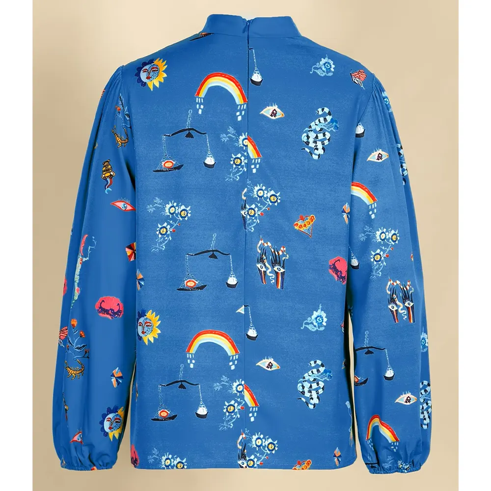 Ιδιαίτερη μπλούζα σε μπλε ηλεκτρίκ. Διαθέτει “mystic” τύπωμα με σύμβολα όπως ουράνια τόξα, μάτια και ζώδια, προσφέροντας έναν artistic αέρα στις εμφανίσεις σας.