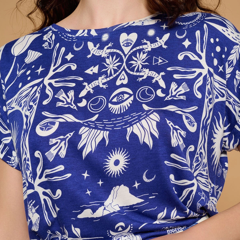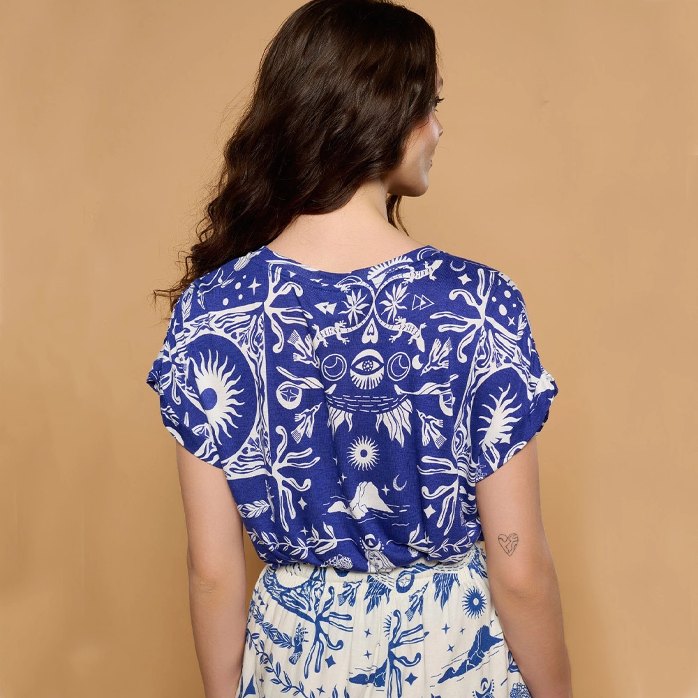 Δώστε μια αύρα μυστηρίου στις καθημερινές σας εμφανίσεις με το Blue Tanit T-Shirt της Minueto. Αυτό το υπέροχο t-shirt σε βαθύ μπλε χρώμα κλέβει τις εντυπώσεις με το all-over print από λευκά μυστικιστικά σύμβολα, όπως ήλιους, φεγγάρια και αστέρια, που δημιουργούν μια μοναδική αντίθεση.