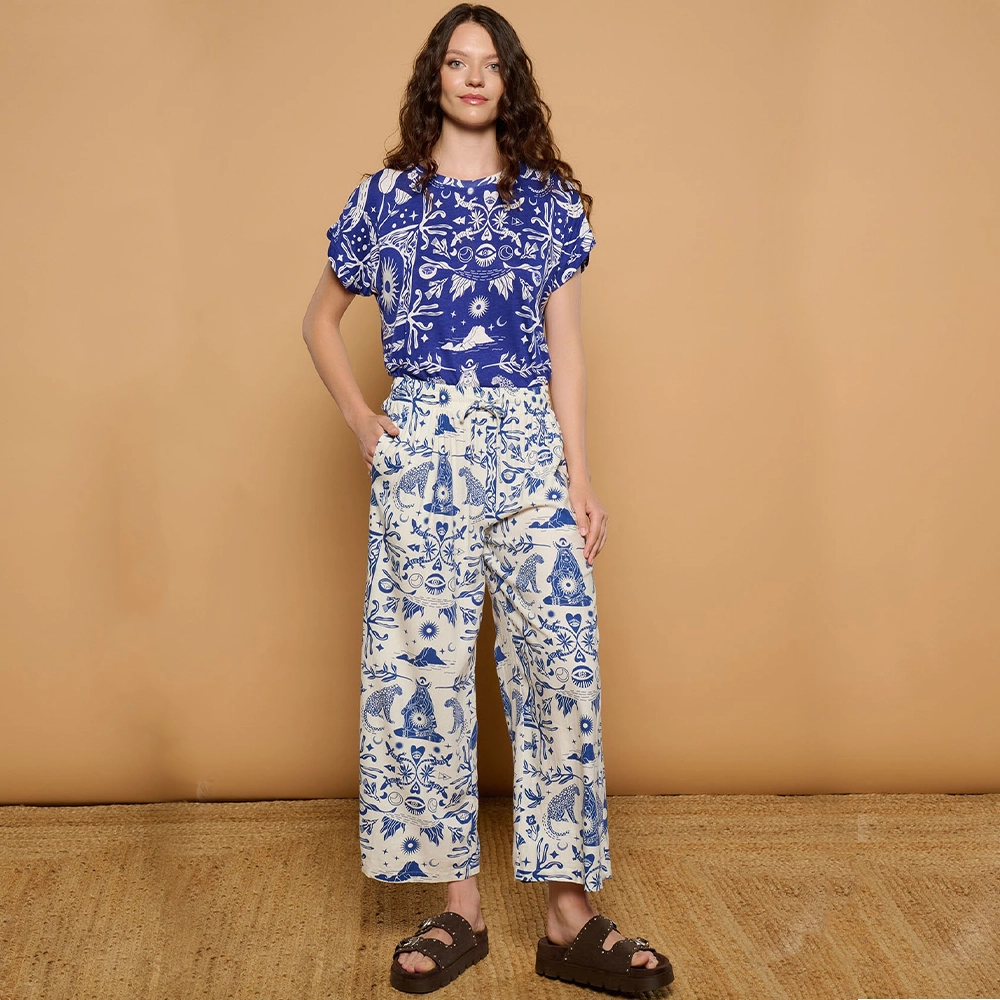 “Για ένα statement look, τολμήστε να το συνδυάσετε με την αντίστοιχη Tanit Trousers (λευκή με μπλε σχέδια) παίζοντας με το ‘negative’ των χρωμάτων! Εναλλακτικά, ταιριάζει άψογα με ένα λευκό denim σορτς ή μια jean φούστα για ένα cool και αέρινο αποτέλεσμα.