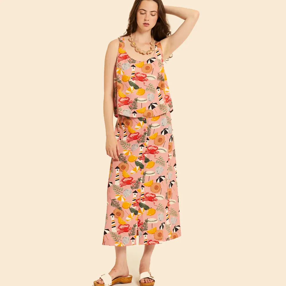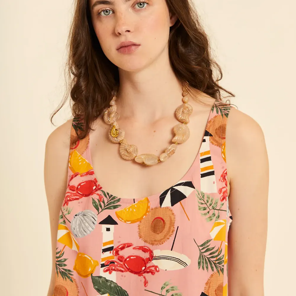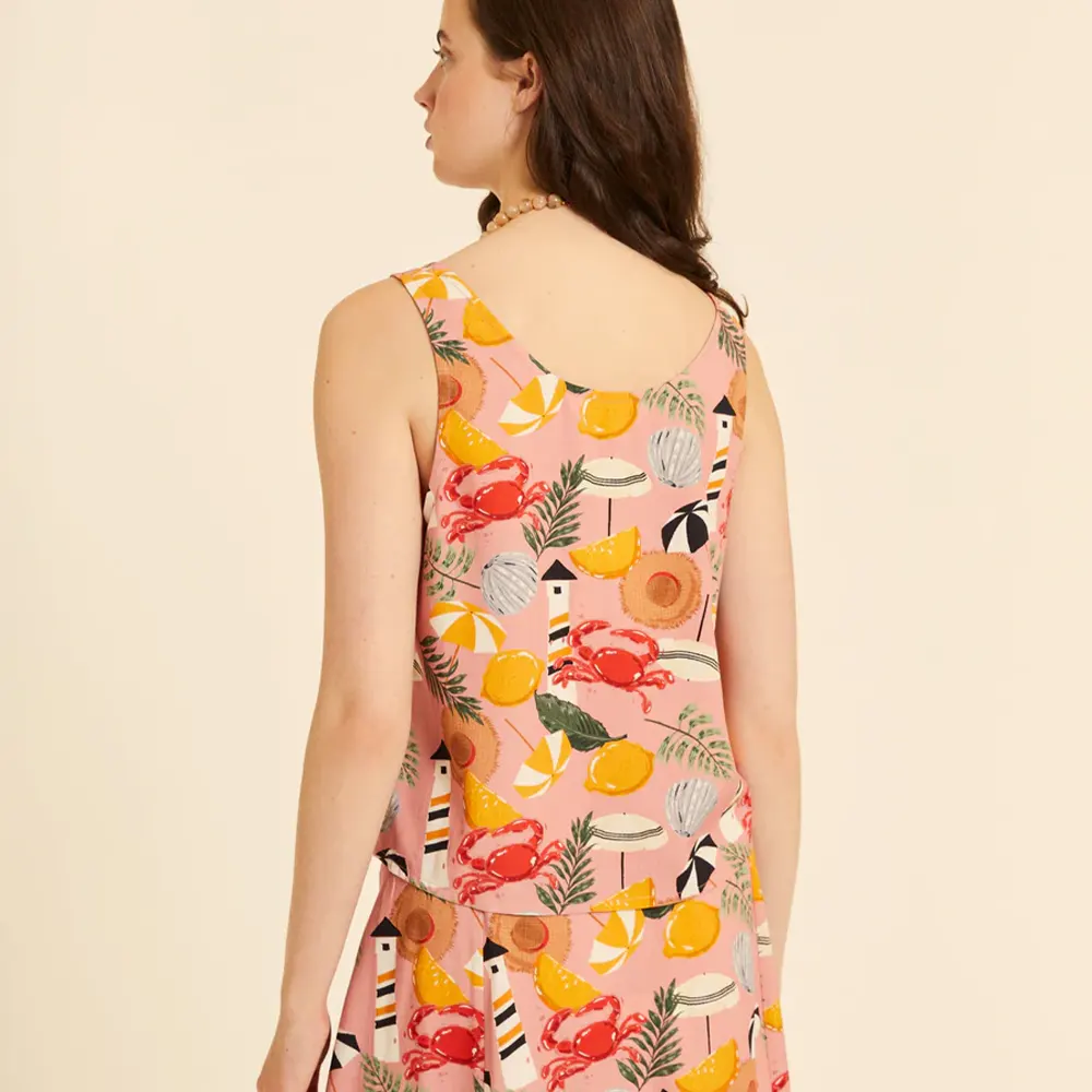 Ολοκλήρωσε το καλοκαιρινό σου στυλ με αυτό το αμάνικο τοπ από την Pepaloves. Διαθέτει all-over print σε ροζ φόντο, με λεπτομέρειες από τη ζωή στην παραλία
