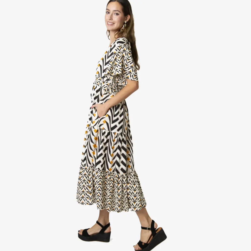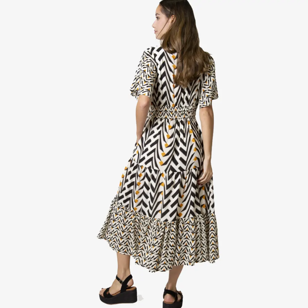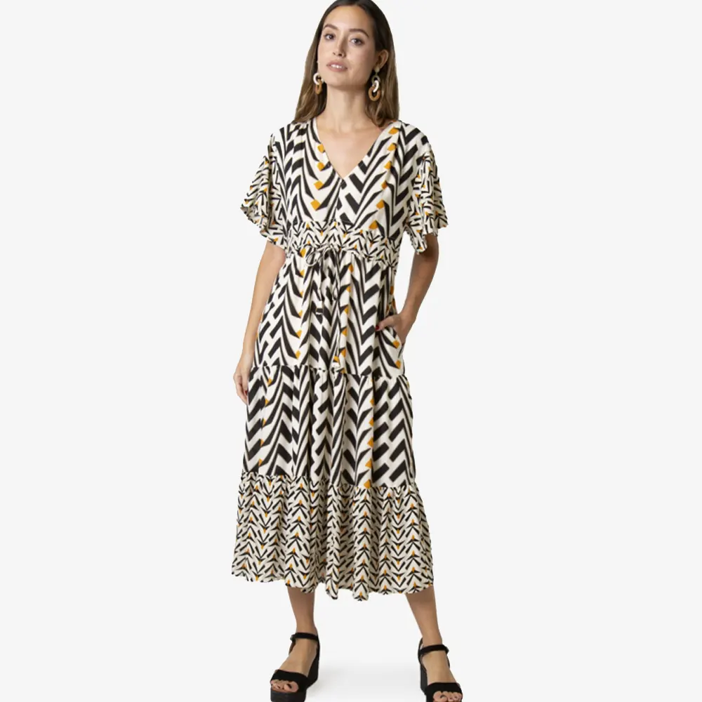 Φόρεμα με χυτό ύφασμα, V ντεκολτέ και λάστιχο στη μέση. Εχει βολαν στη φούστα και μανίκια καμπάνα. Με V-print σχέδιο σε χρώματα: λευκό,μαύρο και μουσταρδί.