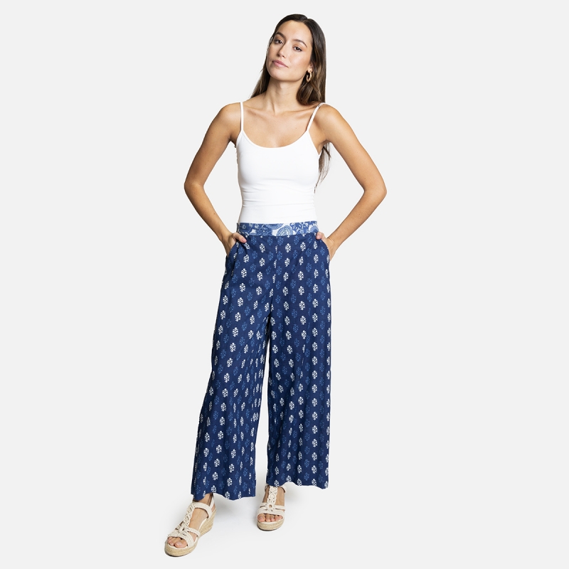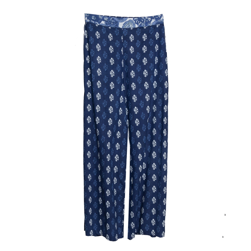Παντελόνι ψηλόμεσο με φαρδύ μπατζάκι από φυσικό βαμβάκι, με πλαϊνές τσέπες και λάστιχο πίσω στη μέση, με φλοράλ τύπωμα.