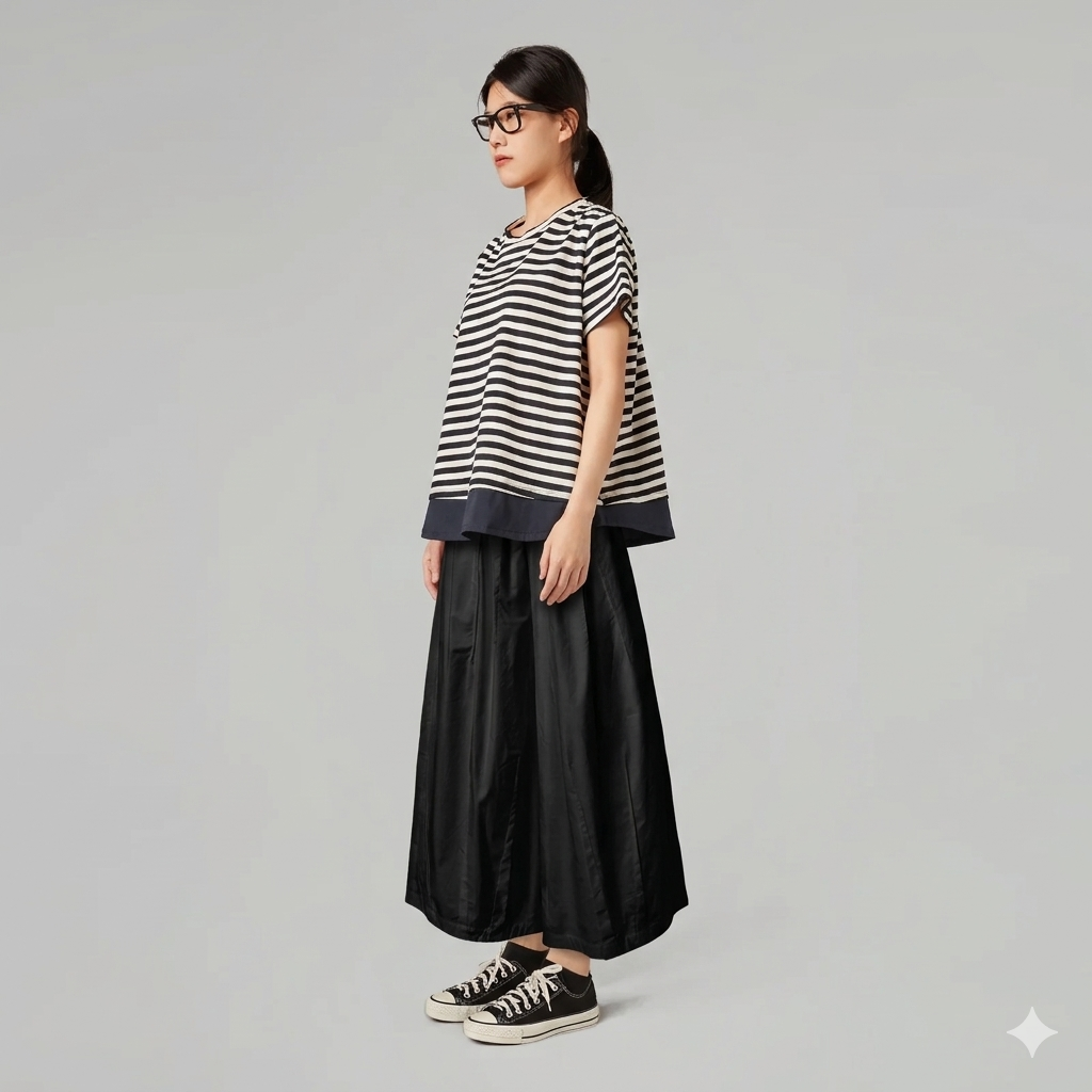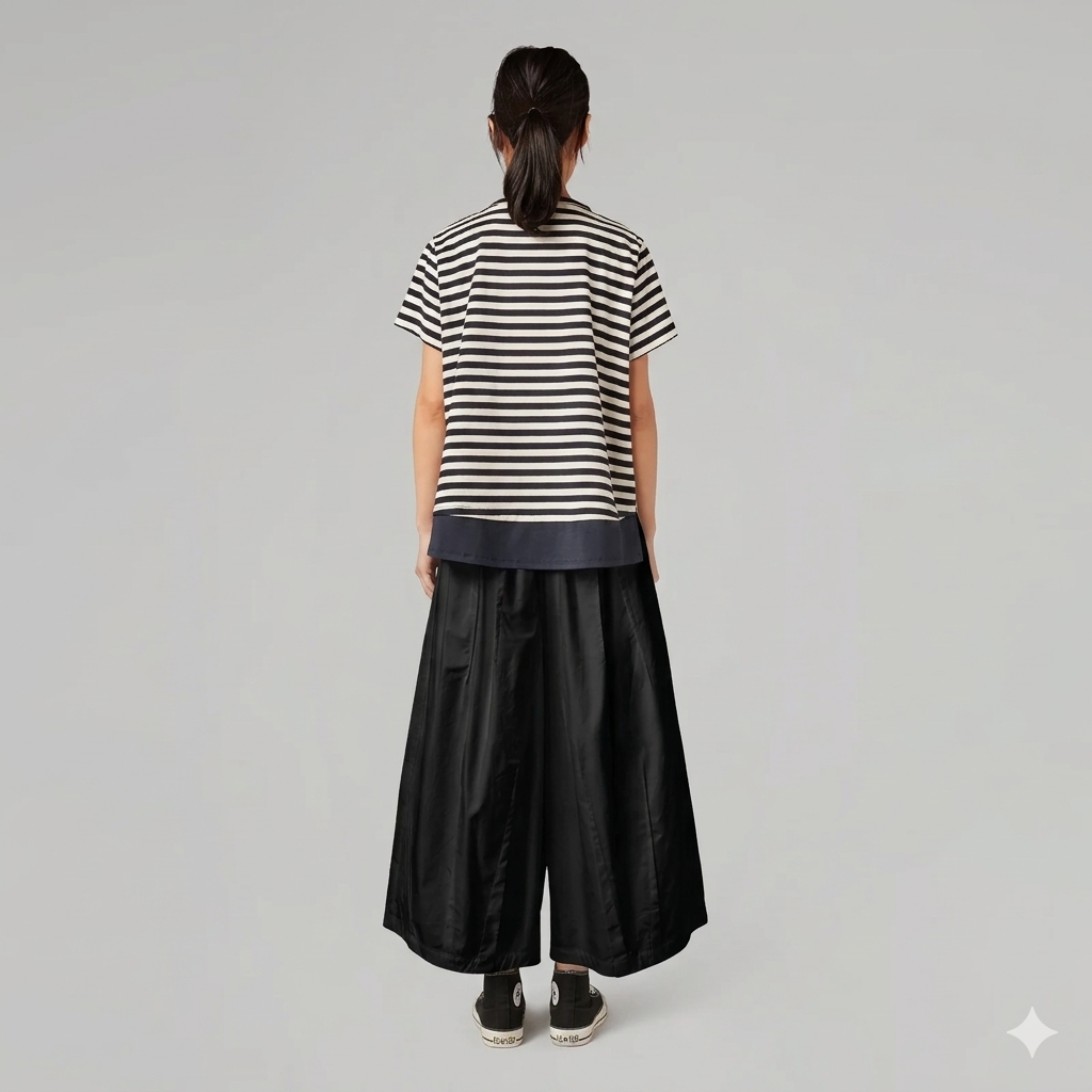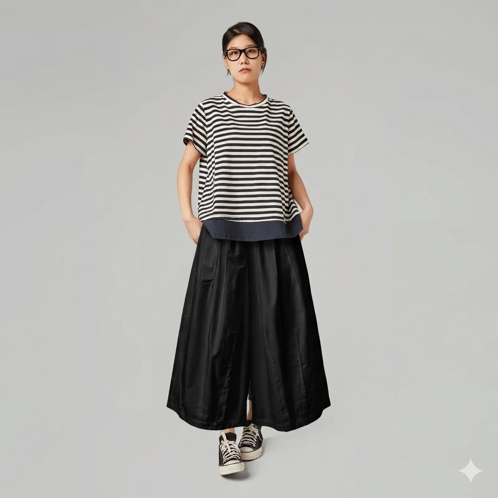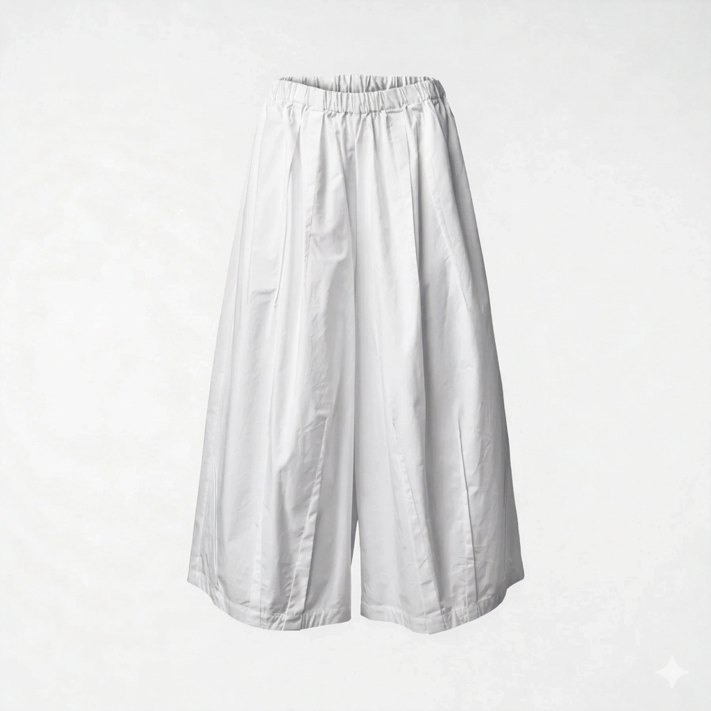 Architectural Volume: Οι βαθιές κάθετες πτυχώσεις δημιουργούν ένα εφέ “φούστας-παντελονιού” που κολακεύει κάθε κίνηση.