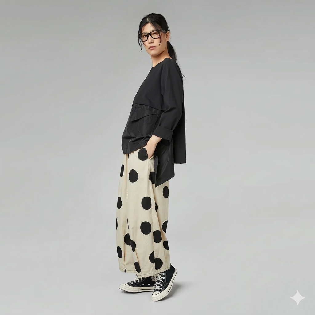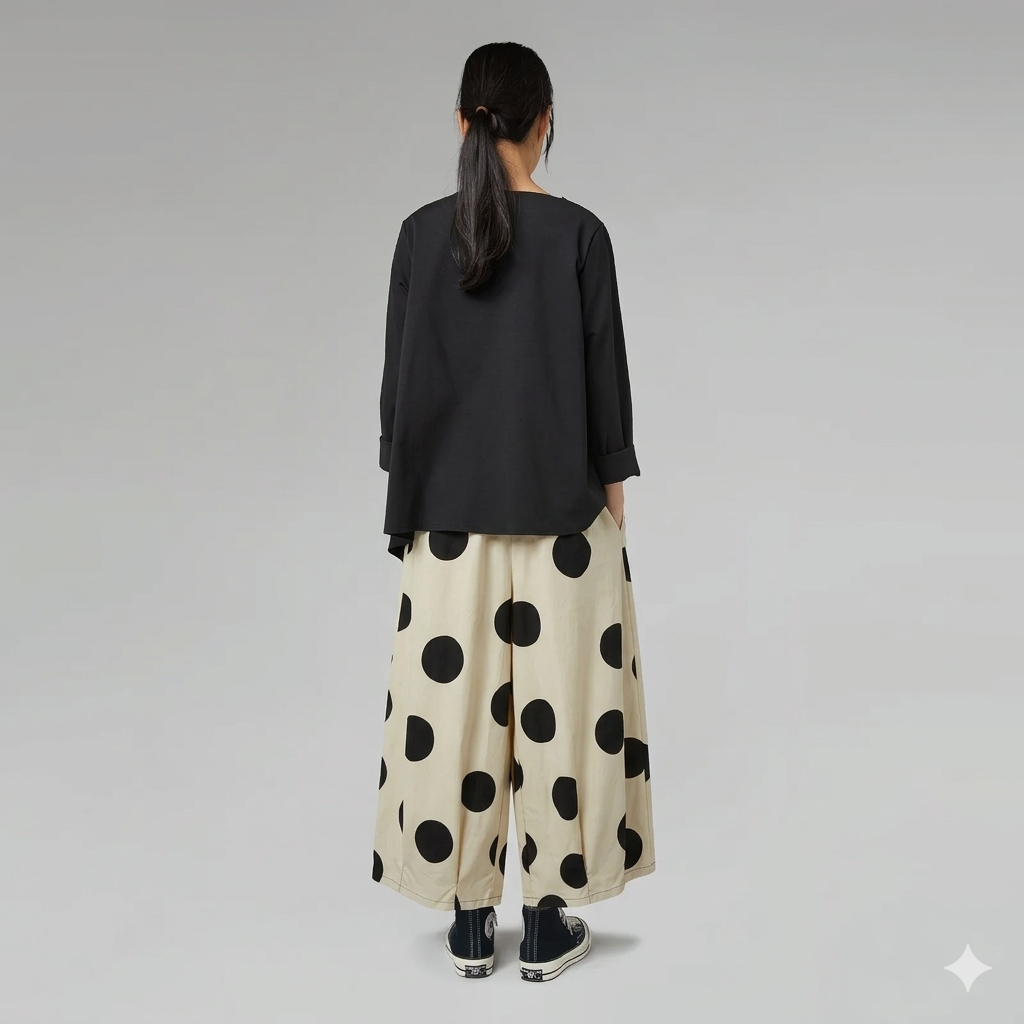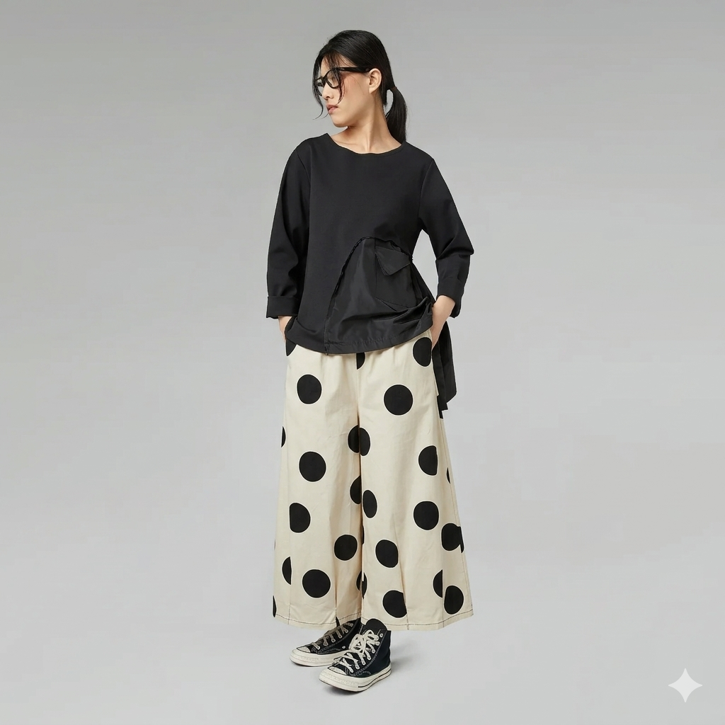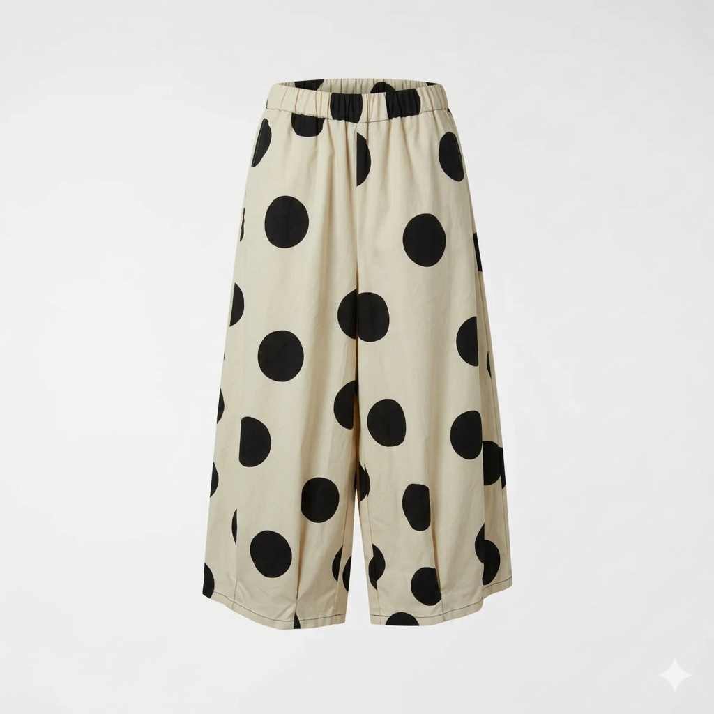 Η Wendy Trendy φέρνει την επανάσταση στο basic ντύσιμο με αυτή την εντυπωσιακή wide-leg παντελόνα. Το διαχρονικό πουά (polka dot) επιστρέφει στην πιο bold εκδοχή του, με μεγάλα prints που χαρίζουν κίνηση και στυλ σε κάθε σας βήμα.