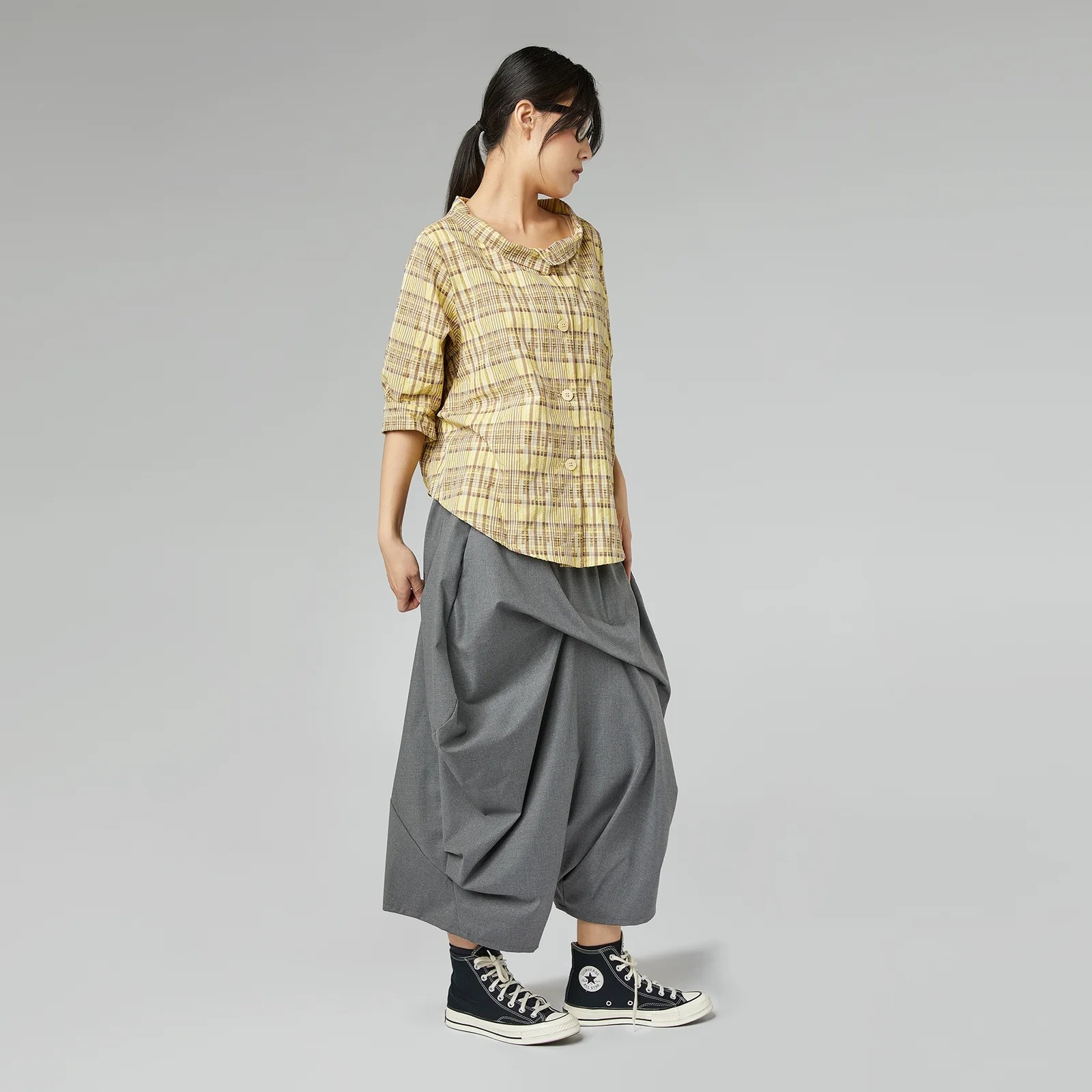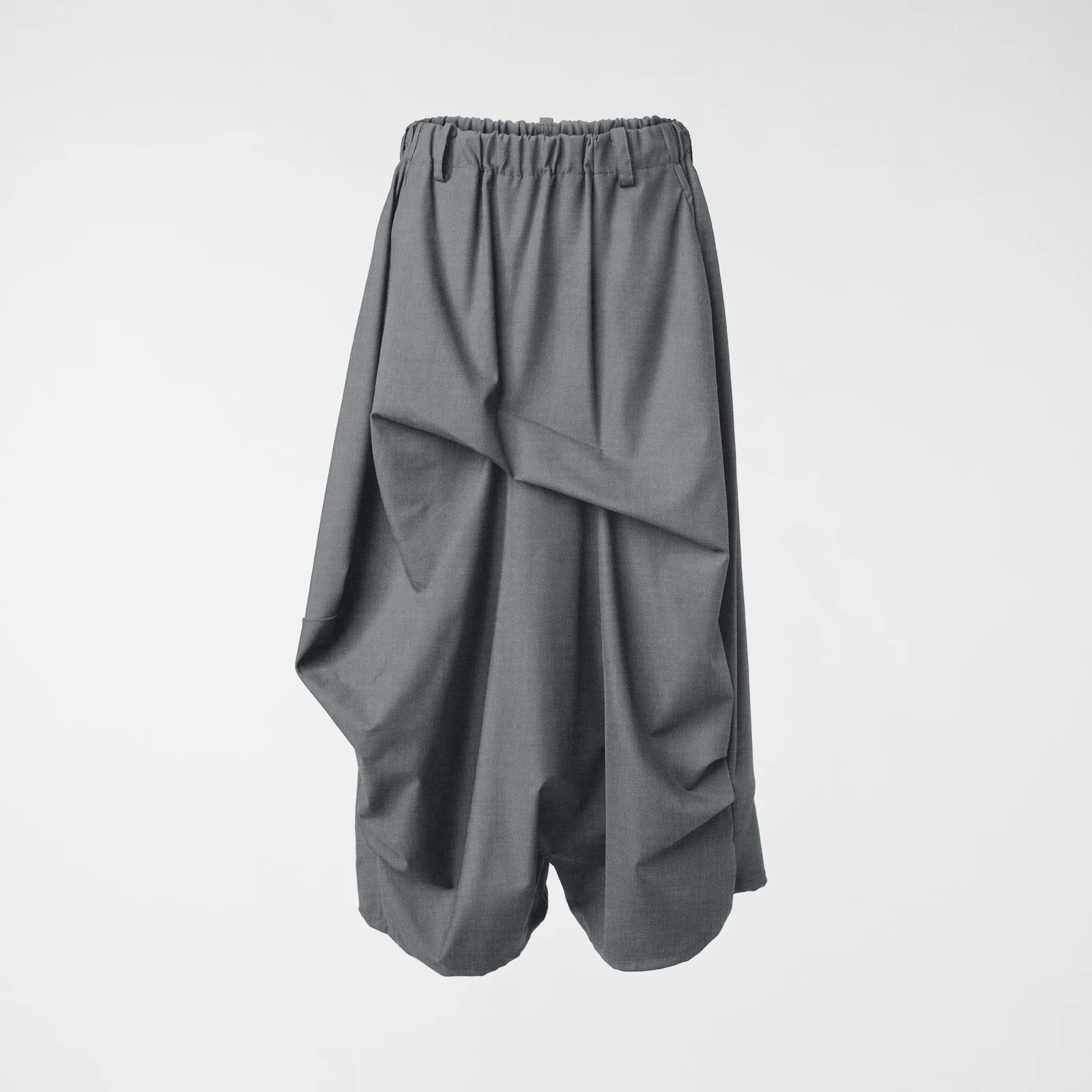 Αυτό το γκρι skort ξεχωρίζει για τον αρχιτεκτονικό του σχεδιασμό, με βαθιές πιέτες που δημιουργούν έναν εντυπωσιακό όγκο και μια ασύμμετρη κίνηση.