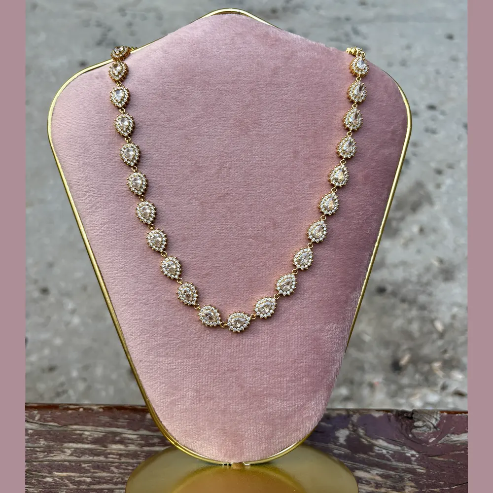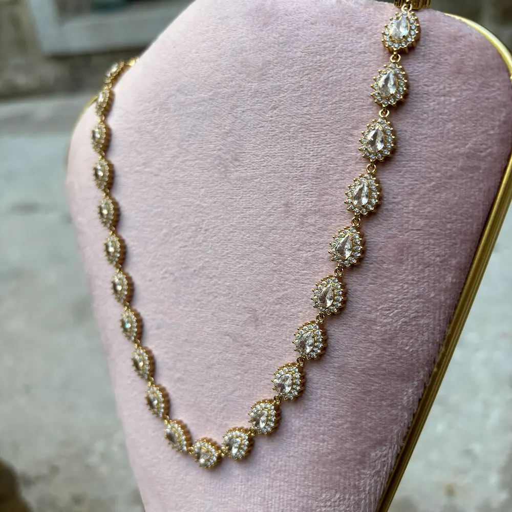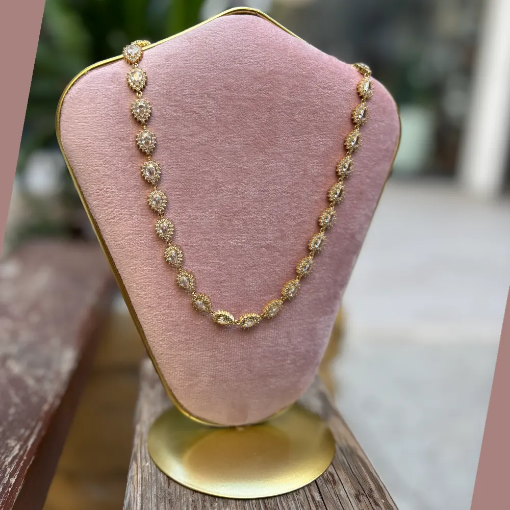 Ριβιέρα λαιμού χρυσή από ατσάλι, αστράφτει ολόκληρο με τα λευκά ζιργκόν του. Εύκολο να συνδυαστεί, προσφέρει ντελικάτη γοητεία στην εμφάνιση σας.