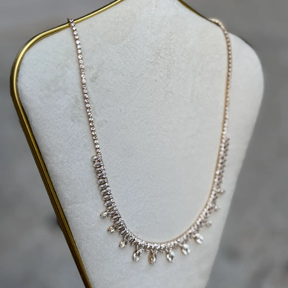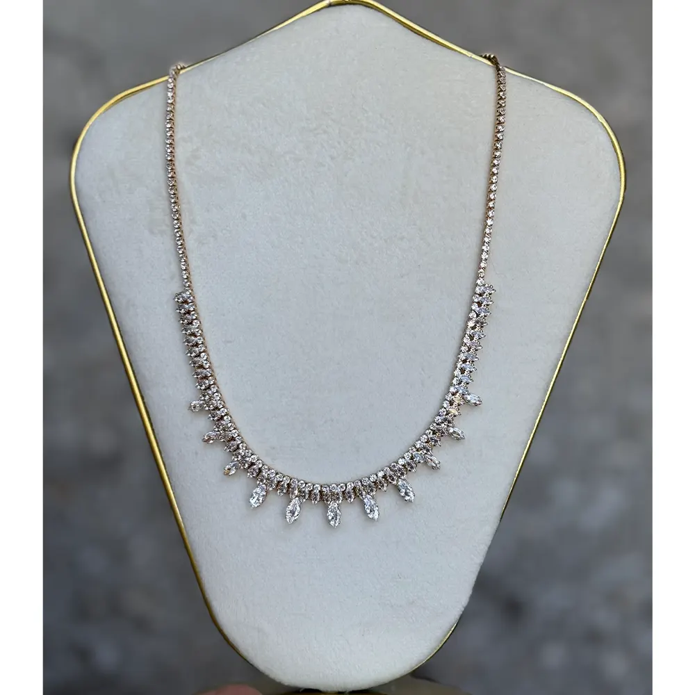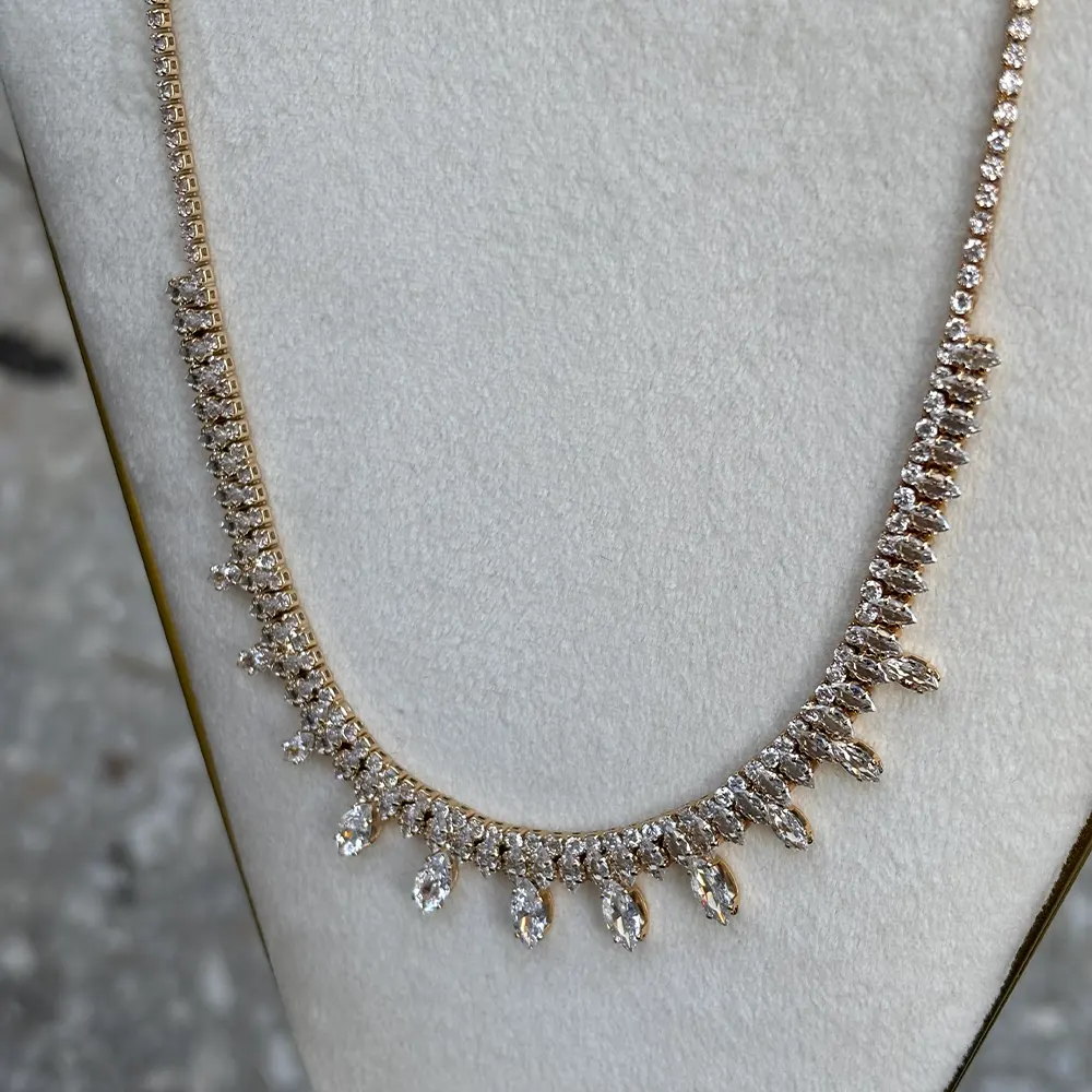 Ριβιέρα λαιμού χρυσή από διπλά επιμεταλλωμενο ορείχαλκο, αστράφτει ολόκληρο με τα λευκά στρας του. Προσφέρει ντελικάτη γοητεία στην εμφάνιση σας.