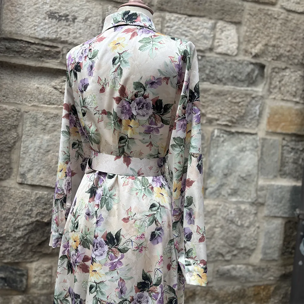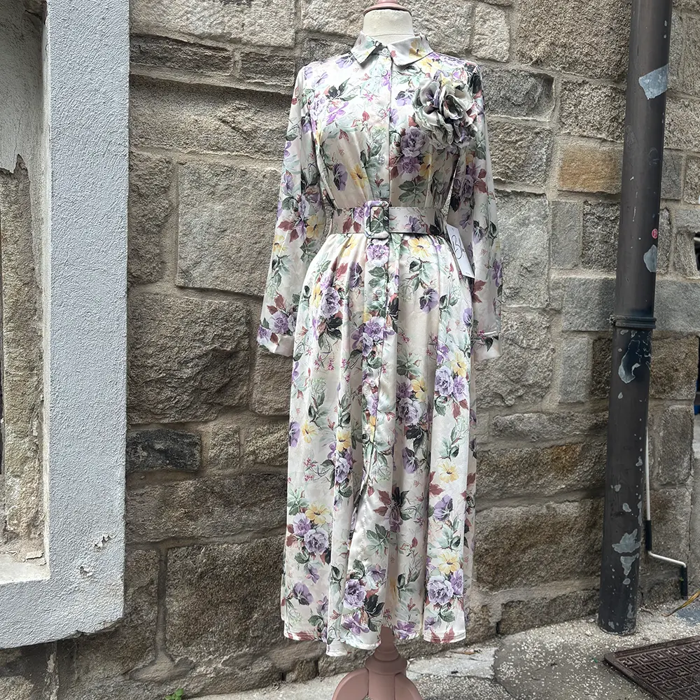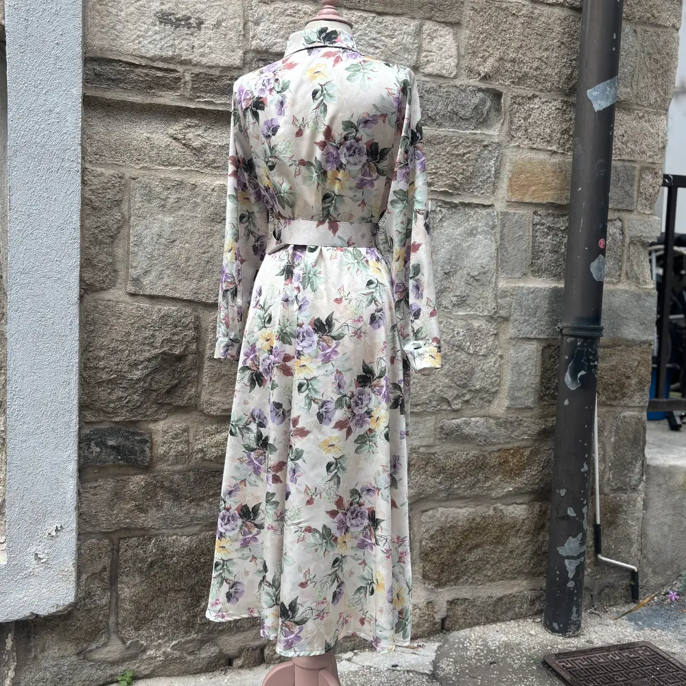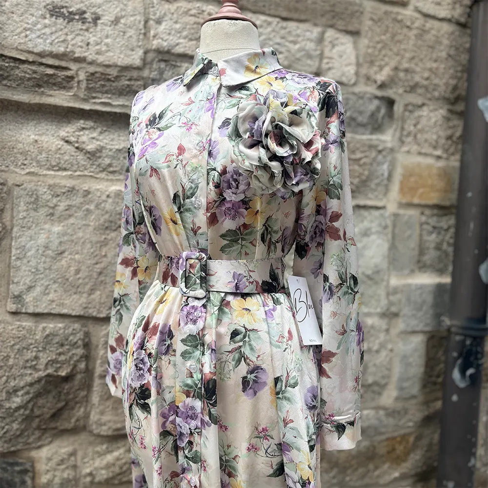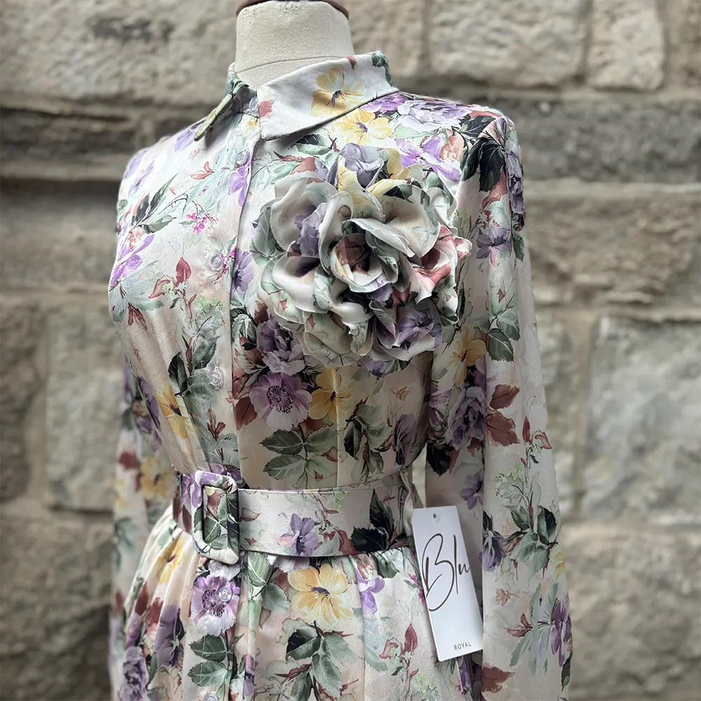 Φλοράλ φόρεμα μίντι, σατέν με αποσπώμενη μπουτονιέρα. Κλείνει με κουμπιά που καταλήγουν σε γιακά ένω έχει ζώνη στο ίδιο print. Στο πλάι έχει κρυφές τσέπες.